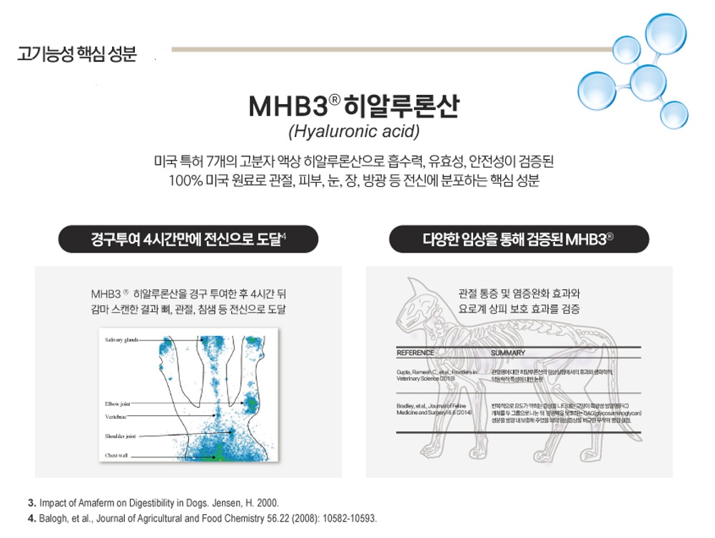 A. 현재까지 보고된 바에 따르면, 고분자 액상 히알루론산(MHB3®)은 개와 고양이에서 매우 안전하며, 부작용 발생률이 극히 낮습니다.