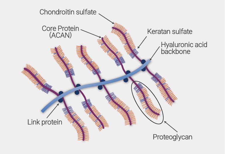 A. 히알루론산은 GAG(Glycosaminoglycan)의 핵심 뼈대입니다. 뿐만 아니라, 관절강 내에서 점탄성을 높여 윤활 작용(lubrication)을 강화하고, 연골 세포(Chondrocyte)의 염증성 사이토카인(IL-1β, TNF-α) 억제에 관여하여, 결과적으로 통증과 염증 완화 및 연골 손상 억제 효과를 보이기 때문입니다.