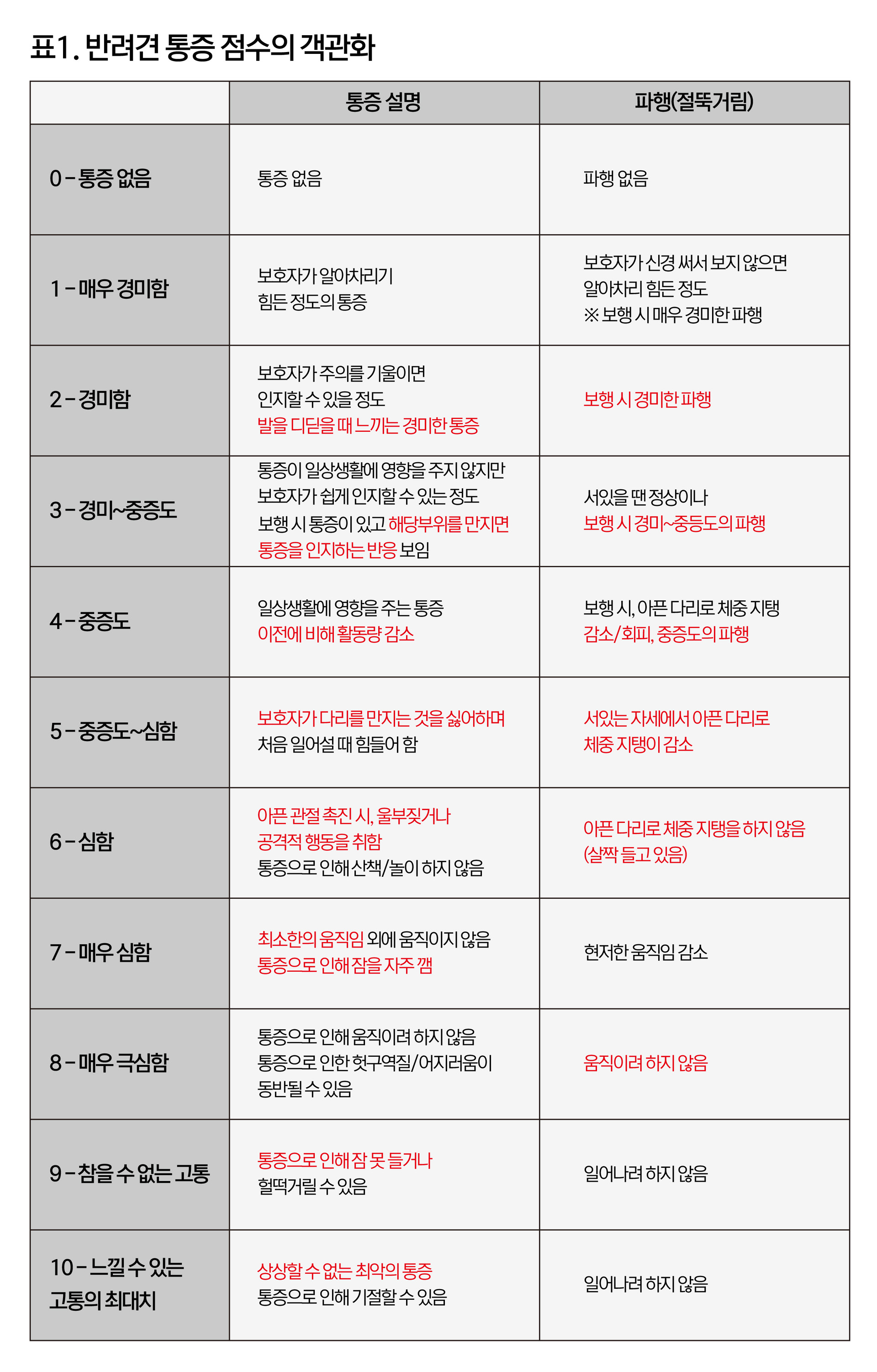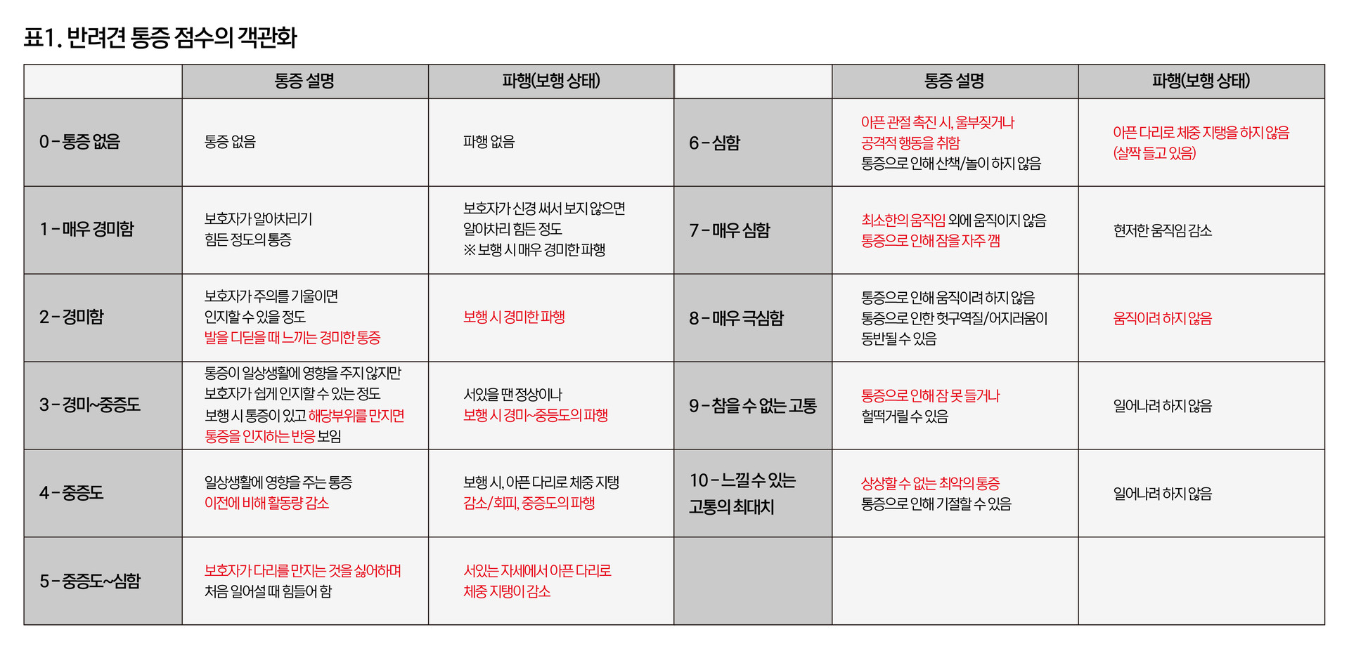 본 설문지에 나온 관절염통증평가지표를 활용, 통증지표 2-7단계에 해당하는 반려견 모집