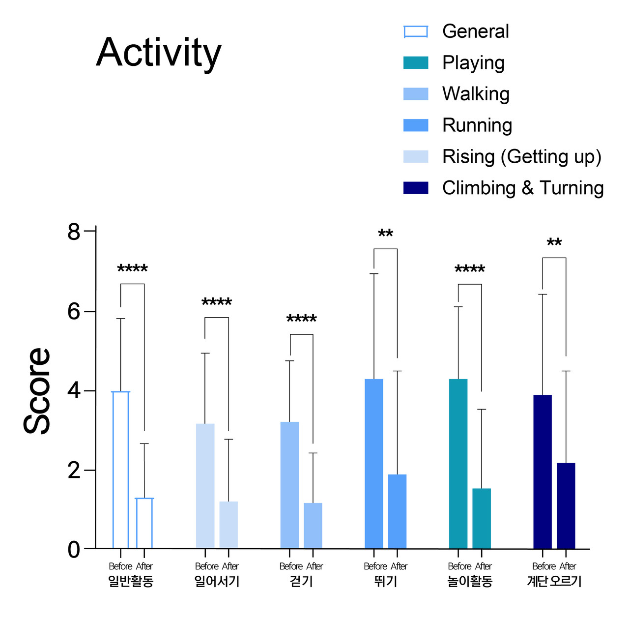 • 비오탁 급여 후, 특히 걷는 능력, 누웠다가 일어나는 능력, 놀이 활동 부분의 개선이 통계적으로 유의하게 확연히 좋아짐 (***P < 0.001 : 매우 강하게 유의함)