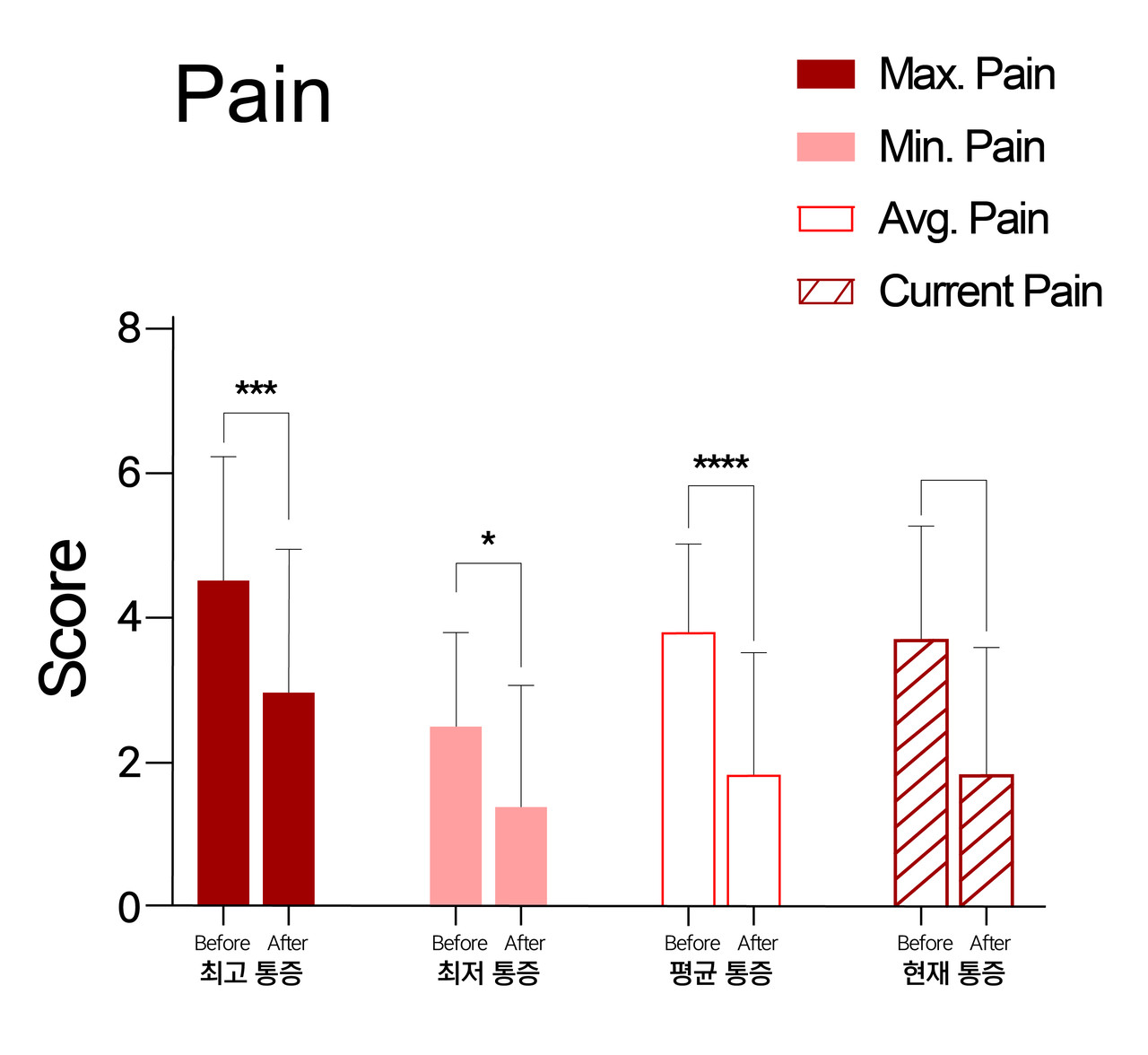 • 비오탁 급여 후, 특히 평균 통증 개선과 현재 느끼는 통증의 개선이 통계적으로 유의하게 확연히 좋아짐