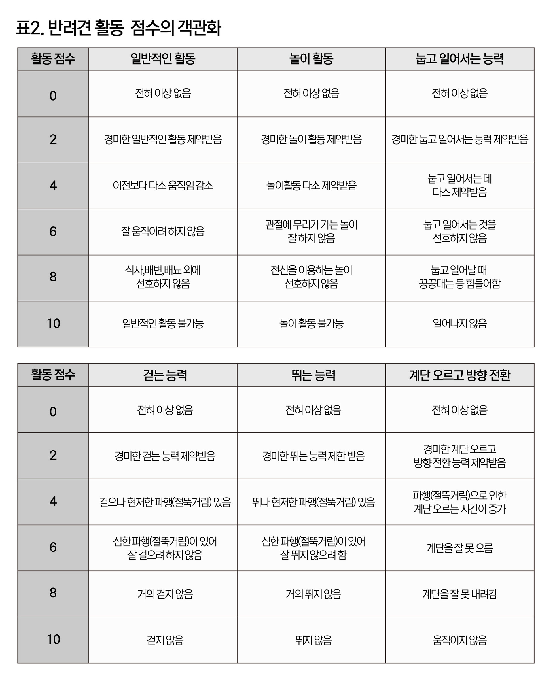 미국 펜실베니아 수의과대학 개발 설문지 · 국내 검역원 골관절염 치료제 공인 평가지표